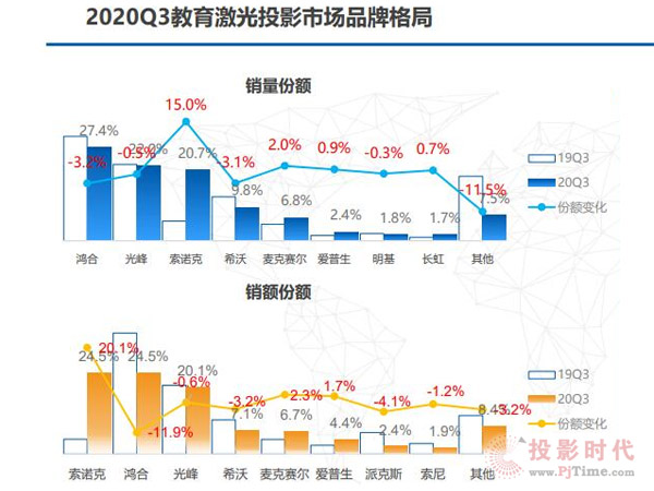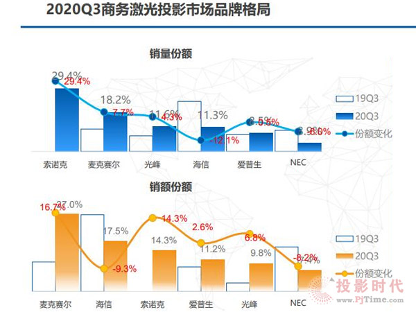 “依托商教市場的增量,索諾克實現了新的躍遷!”第三季度,激光投影市場,索諾克整體銷量排名第二,僅次于海信,占有率12.1%,增幅308.1%;銷額占10.5%,增幅250.9%。海信的家用、索諾克的商教,已經成為2020年激光投影市場增長的“標桿”!