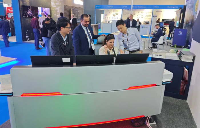 展會現(xiàn)場,充滿未來感、科技感的智慧控制臺吸引了海外客戶沉浸式體驗,照彰銷售經理與客戶英語交流并詳細解答,將智慧控制臺的智能化功能,設計理念,使用場景,匠心工藝,整體用材等一一介紹,產品深得海外客戶的青睞!