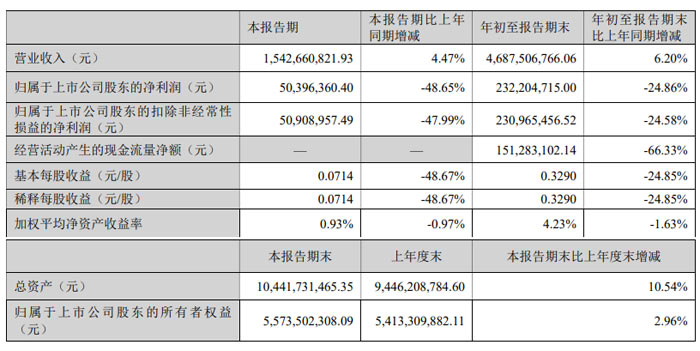 前三季度維度:1-9 月累計實現(xiàn)營業(yè)收入 24.57 億元(2,456,612,892.75 元),同比下降 11.14%;歸屬于上市公司股東的凈利潤 8229 萬元(82,285,702.53 元),同比下降 66.42%;扣非后凈利潤 6388 萬元(63,875,768.26 元),同比下降 71.08%。