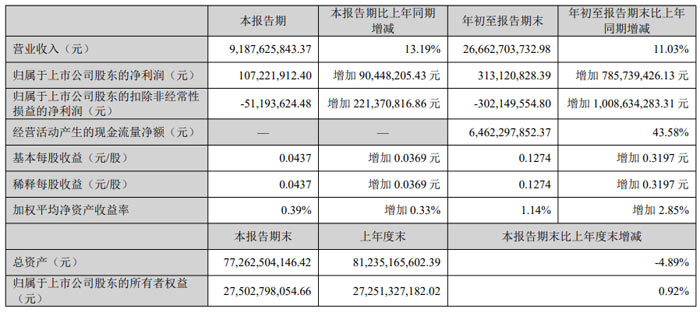 2025 年 1-9 月,公司經營業績持續改善,實現營業收入 266.63億元,同比增長 11.03%;歸屬于上市公司股東的凈利潤 3.13億元,較上年同期增加 785739426.13 元,成功實現扭虧為盈,盈利能力大幅提升。