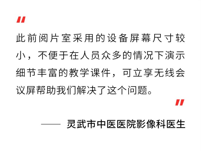 在引入可立享無線會(huì)議屏之前,靈武市中醫(yī)醫(yī)院的影像科最亟待解決的問題在于如何提升會(huì)診效率。當(dāng)面臨疑難病癥時(shí),會(huì)診是靈武市中醫(yī)醫(yī)院最直接高效的溝通協(xié)作方式,主治醫(yī)生需要使用各自的筆記本電腦,通過無線投屏分享患者的病歷資料。以往會(huì)議屏幕與筆記本電腦等終端設(shè)備的連接、登錄等通常步驟繁瑣,操作不便,大幅影響會(huì)診效率。