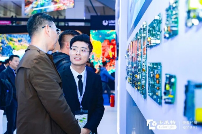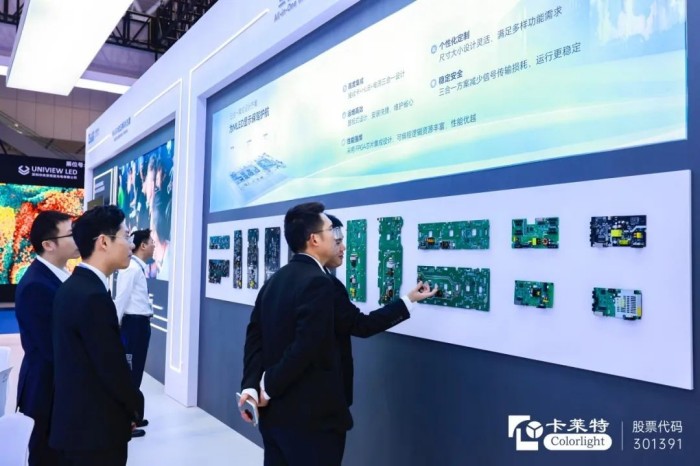 電子桌牌、全向麥克風、會議攝像頭……卡萊特在展區完美復原智能會議現場,并基于新品AX系列播控處理器,實現了多圖層、8K視頻解碼、文檔演示、視頻播放、多平臺終端無線投屏、紅外觸摸、電子白板等會議功能。為智能化的未來會議室提供全鏈路解決方案,便捷、高效的智能化會議吸引眾多客戶駐足體驗。