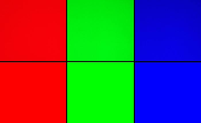 上圖中,下部分為R/G/B三原色原圖,上圖為極米RS 20 PLUS投影實拍圖